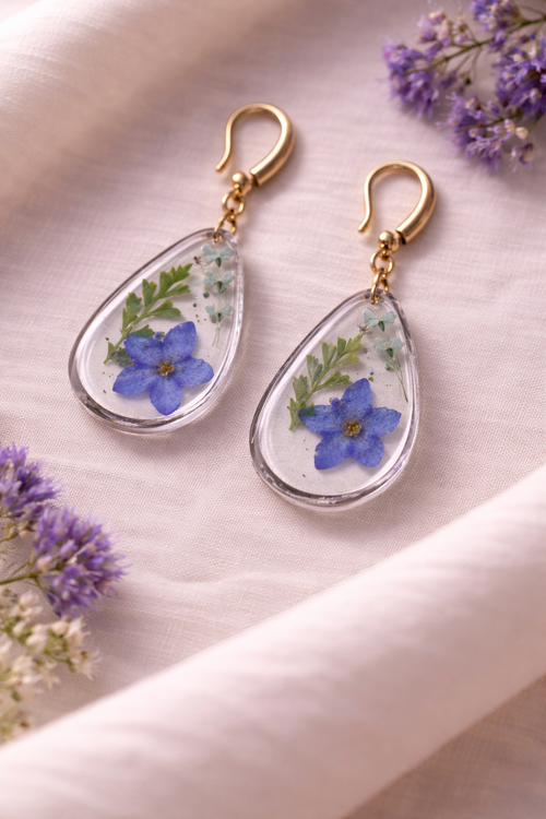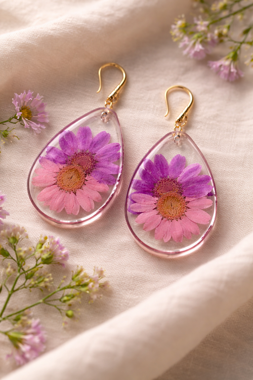 Chaque fleur naturelle est soigneusement séchée puis intégrée à la main dans une résine transparente, capturant ses détails et sa profondeur. Ce travail artisanal rend chaque paire unique : de subtiles variations peuvent apparaître, faisant de chaque bijou une création singulière.